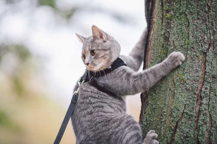 Pour la même raison, mieux vaut ne pas lui permettre de grimper aux arbres lorsqu'on le promène en laisse vêtu d'un harnais relié à une laisse : l'un comme l'autre pourraient s'accrocher dans une branche et être à l'origine d'un accident. Le risque existe d'ailleurs aussi si la laisse est attachée à un simple collier.