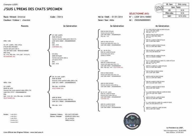 Le pedigree comporte différentes informations concernant l’animal et ses origines : sa race, son sexe, sa robe, sa date de naissance, sa généalogie sur les trois dernières générations, le nombre et le sexe des autres chatons de la portée ainsi que le nom et l’adresse de l’éleveur.