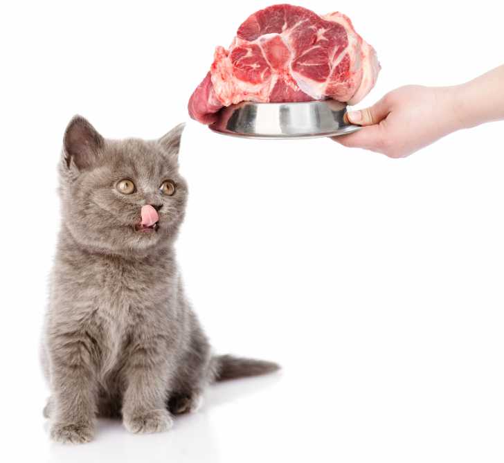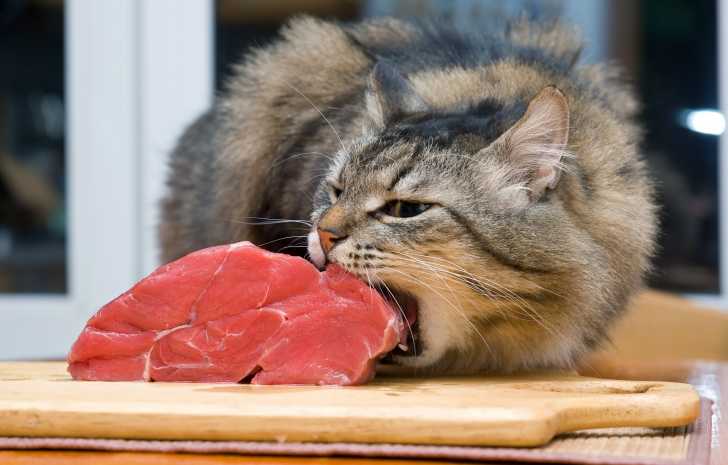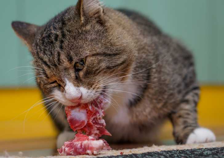 Le chat est un animal carnivore qui, dans la nature, se nourrit presque exclusivement de petites proies, telles que des souris ou des oiseaux. À défaut de pouvoir chasser, le chat domestique, qu'il reste ou non à l'intérieur, peut trouver son compte dans une nourriture à base de viande crue.