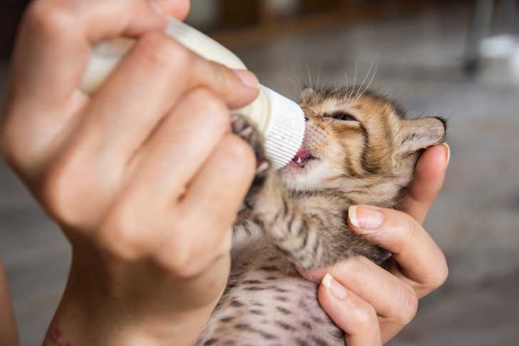 Si la mère est en mesure de l'allaiter, il n'est pas nécessaire de le nourrir soi-même. En revanche, si elle n'est pas en mesure de le faire correctement ou si elle est absente, il faut donner du lait maternisé au chaton, c'est-à-dire un lait conçu pour lui permettre de grandir en bonne santé. Le lait de vache, de chèvre, de brebis ou d'autres mammifères est à proscrire, car il contient trop de lipides et pas assez de protéines ni de minéraux par rapport au lait de chatte.