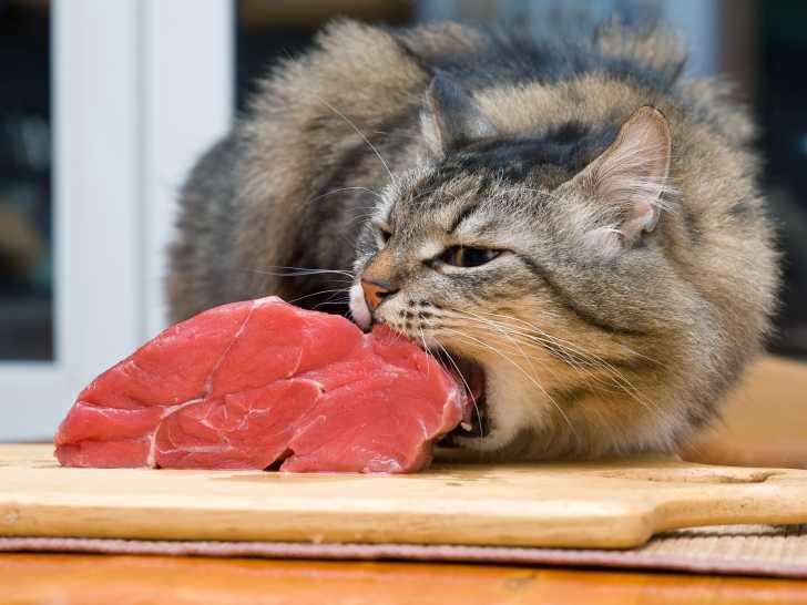 Dans la mesure où les chats sont des animaux carnivores, il n'est pas surprenant qu'ils soient très friands de viande - bien plus que de croquettes ou de pâtée. Ils peuvent même en manger beaucoup et fréquemment sans s'en lasser. Cela ne signifie pas pour autant qu'ils peuvent se nourrir uniquement de cela.