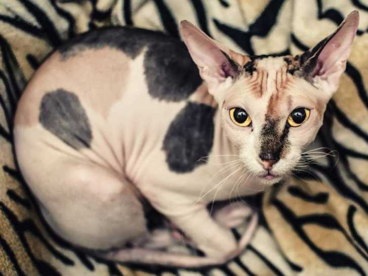 Le Peterbald est un félin d’origine russe au look vraiment extraordinaire : en plus d’être dépourvu de poils, il possède une tête triangulaire, de très grandes oreilles de chauve-souris et de toutes petites moustaches. Et même s’il n’a pas de poils, sa peau est douce comme du velours.