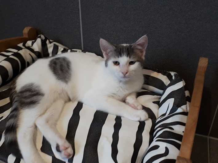 Devinez pourquoi je m’appelle Caresse ? C’est bien moi le cœur sur pattes que vous désirez tant. Ma belle fourrure blanche avec mon casque et ma queue grise vont vous séduire. Je suis une minette de type Européen, née le 3 août 2021.