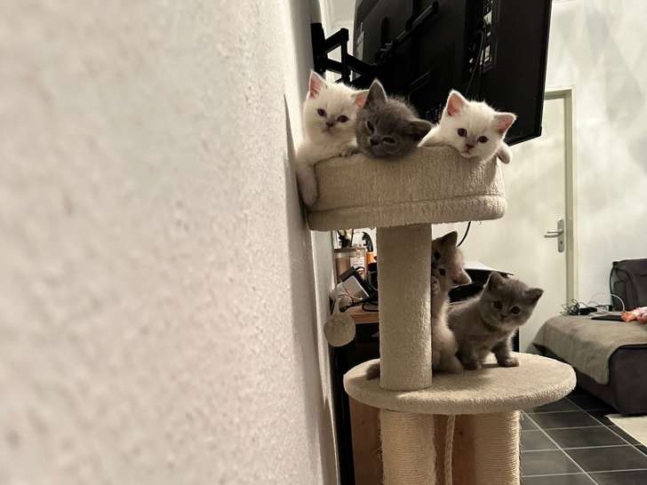 J ai 4 chatons British shortair bluepoint nee le 10 aout ils sont très câlins et sociale habituer aux enfants , nous avons le pedigree des parents
