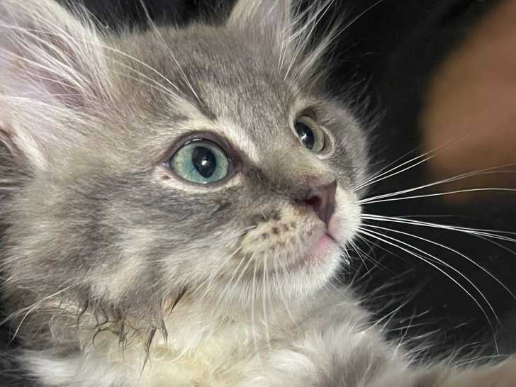 Le chaton est de couleur bleu solide bicolore et il a le poil long. C'est le fils du champion d'Europe Viking et de la championne Lottie. Il est porteur cinnamon (gène hyper récessif).