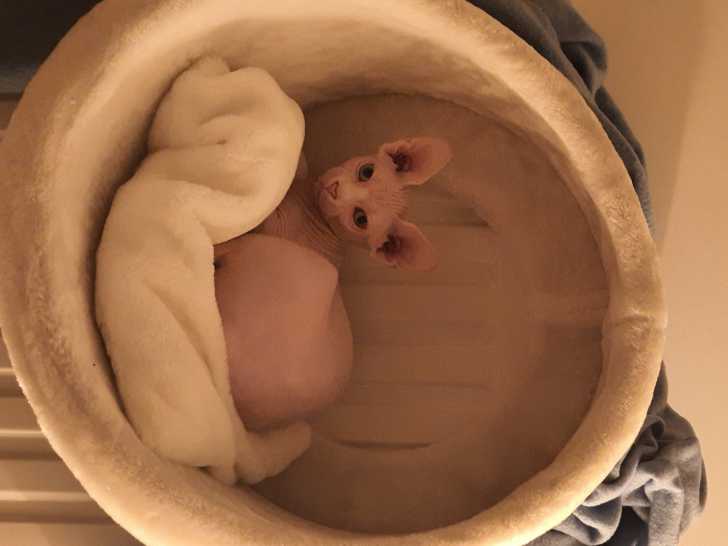 Voici Talisman, un petit Sphynx d'amour aux yeux vairons de 6 mois. Avec lui, ronrons et câlins sont garantis pendant des heures.
