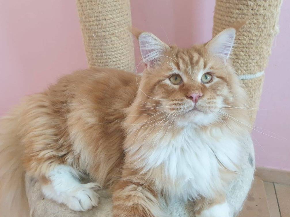 Prince, magnifique mâle Maine Coon red blotched tabby, est disponible suite à notre cessation d'élevage. Né le 8 mars 2019, ce compagnon au caractère établi recherche une famille calme pour sa retraite.