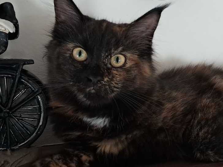 La chatterie des Cats of Cthulhu propose à l'adoption Azraelle, une magnifique femelle Maine Coon LOOF de couleur black tortie ("écaille de tortue"). Née le 13 mai 2025, elle est disponible immédiatement (à 12 semaines révolues) pour 1000 euros.