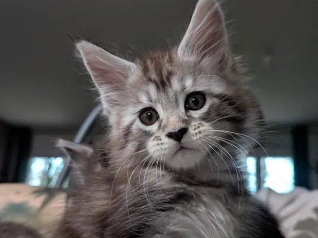 Un chaton mâle Maine Coon black silver mackerel tabby, nommé Anton, né le 18 septembre 2025, attend sa famille. Il est le dernier bébé disponible sur une portée de sept chatons, inscrits dans le Livre Officiel des Origines Félines (LOOF).