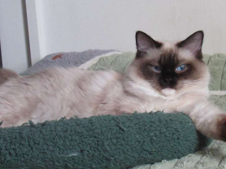 Notre petite Ragdoll, née le 29 avril 2025, est issue d'une lignée sélectionnée et testée pour les maladies génétiques. Cette femelle seal mitted classic, sociable avec les chiens et les chats, possède un caractère équilibré.