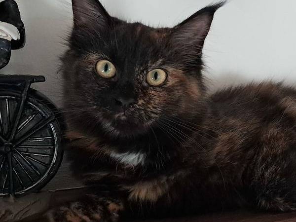 Azraelle, une femelle Maine Coon black tortie, est née le 13 mai 2025. Elle grandit en famille et bénéficie d'une excellente socialisation.