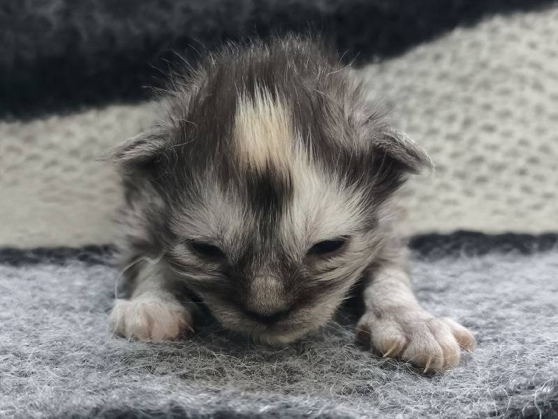 Nous partageons aujourd’hui la naissance d’une portée de Maine Coon au sein de notre élevage Fourrursd'argent. Le 24 février 2026, six chatons ont rejoint notre foyer, trois mâles et trois femelles. Parmi eux se trouve cette femelle que nous proposons en réservation. Elle grandit entourée de ses frères et sœurs, observant chaque mouvement avec la curiosité tranquille propre aux jeunes Maine Coon.