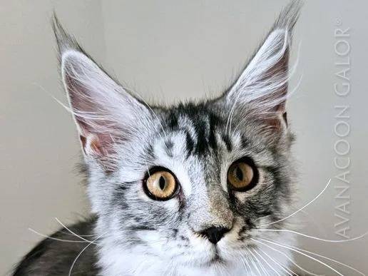 La chatterie Avanacoon GalOr vous propose Awan, chaton Maine Coon mâle bleu tabby et blanc, et Amity, femelle black silver tabby et blanc. Ces deux félins sont nés début mai 2025 dans une portée de trois.