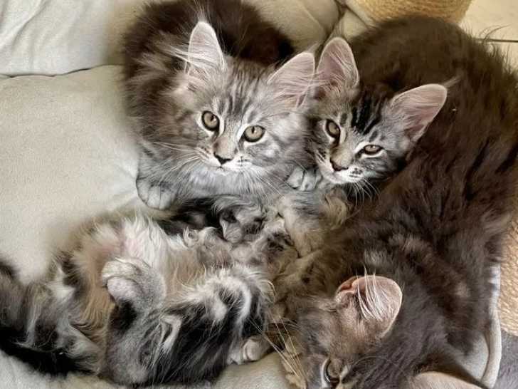 Sur une portée de cinq chatons Maine Coons nés le 25 juillet 2025, il reste cinq bébés à vendre. Nous proposons trois mâles et deux femelles de couleur bleu, brown et black silver blotched tabby. Ces petit...