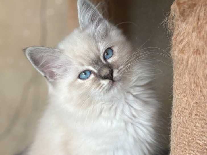 Aristot, mâle Sacré de Birmanie blue tabby est disponible à la vente. Né le 13 juillet 2025 dans une portée de plusieurs chatons, ce trésor joueur, rigolo et extrêmement câlin est disponible pour 890 euros.