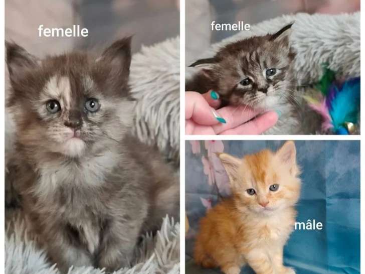 La Chatterie des Joyaux Félins propose trois chatons Maine Coon, inscrits au Livre Officiel des Origines Félines (LOOF), nés le 2 mars 2026. Chacun est proposé au prix de 1 300 euros.