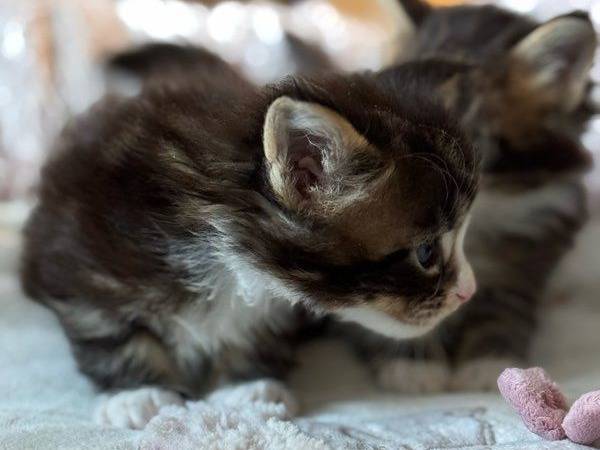 Le 5 décembre 2025 sont nés trois chatons Maine Coons. Deux mâles et une femelle brown mackerel tabby et blanc, inscrits au Livre Officiel des Origines Félines (LOOF), sont disponibles à la réservation.