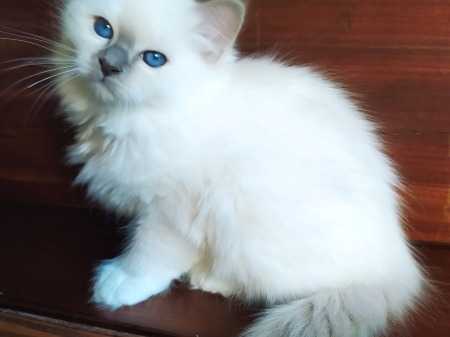 C'est la fille d’un chat mâle lilac à long poil et clair ainsi que d’une mère seal point aux yeux saphir. Ils ont été socialisés et vont à la litière comme des grands.