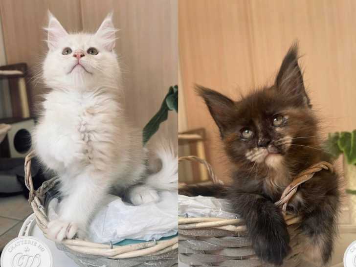 Nous proposons à la réservation quatre chatons Maine Coons inscrits au Livre Officiel des Origines Félines (LOOF), nés le 8 août 2025. Arry, mâle blue mackerel, Adèle, Aglaé et Anouck, femelles aux robes...