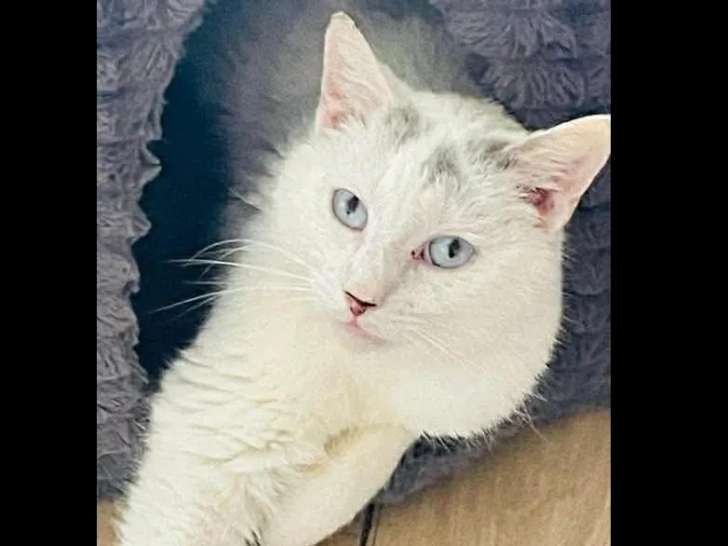 Laissez-vous séduire par Frigost, un chat au pelage blanc avec marque noire de quatre ans, calme, curieux et très affectueux, qui s’épanouira auprès d’une famille attentive avec un jardin.