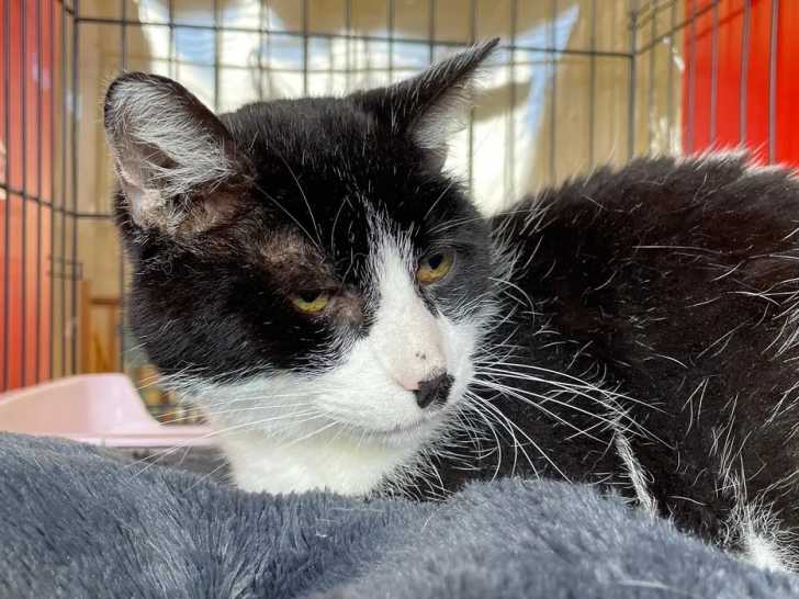 Arboré d'un pelage noir et blanc, Linguini est un chat âgé de dix ans que nous mettons disponible à l'adoption. Il espère trouver une famille aimante, où il passera sa retraite.