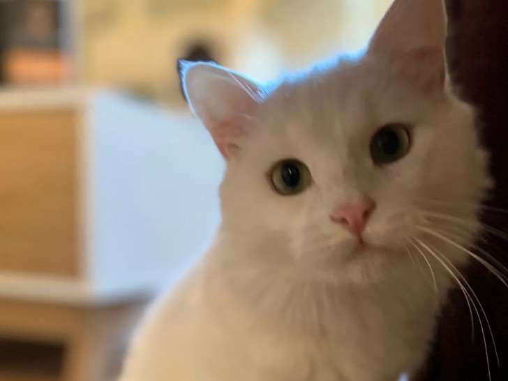 Nous vous proposons à l'adoption ce jeune chat au pelage blanc de deux ans nommé Watson. Il s'entend bien avec ses congénères, mais pas avec les chiens.