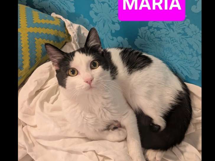 Maria est un chaton femelle au pelage noir et blanc, âgée de huit mois. Douce, sociable et curieuse, elle aime jouer, suivre les humains et s’adapte facilement à un nouvel environnement. Elle apprécie la compagnie et les moments de tendresse.