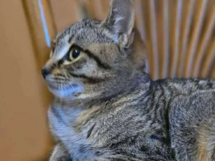 Arborant un pelage tigré gris, Nebby est un chaton femelle âgé de sept mois. Indépendante et peu portée sur les longues caresses, elle apprécie pouvoir vivre à son rythme et aura besoin d’un environnement avec accès à l’extérieur pour s’épanouir pleinement.