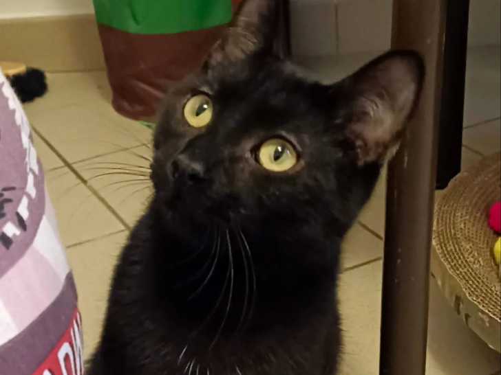 De couleur noire, Pistache est un chaton mâle âgé de sept mois. Très timide, il aura besoin de douceur et de patience. Un accès extérieur est recommandé, et la présence d’un autre chat est idéalement souhaitée pour le rassurer.