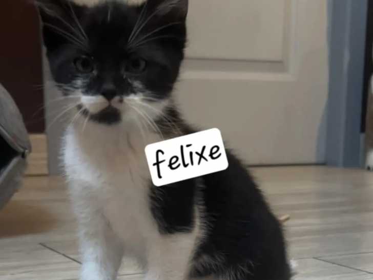 Voici Félix, un chaton femelle de couleur noire et blanche de deux mois que nous sommes enchantés de vous proposer à l'adoption. Il est en attente d'une famille aimante pour une vie épanouie.