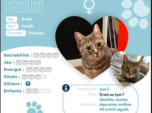 Voici Saki, une chatonne tigrée âgée de onze mois. Joueuse, curieuse et proche de l’humain, elle aime les moments d’interaction et les jeux. Elle recherche un environnement stimulant et adapté à son tempérament affirmé.