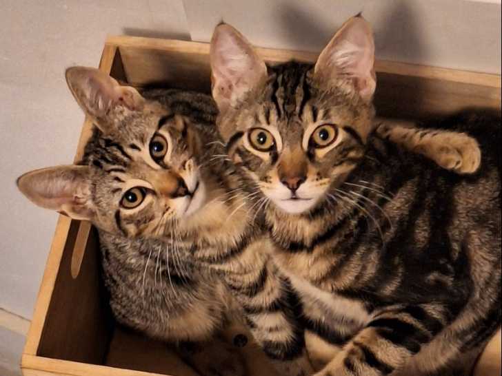 Âgés quatre mois, Volt et Vanda sont deux chatons mâles tigrés de quatre mois en quête d'une famille ayant un jardin et qui leur offrira une belle vie.