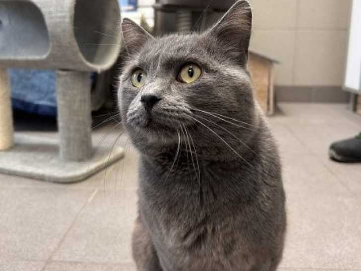 De couleur grise et âgé de huit ans, Moguiz est un chat qui recherche une famille aimante. Il est atteint du virus de l'immunodéficience féline et donc, ne devra pas vivre avec des chats sains.