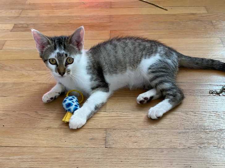 Nous sommes enchantés de vous proposer à l'adoption Amande, une chatonne au pelage tigré blanc de cinq mois. Elle espère trouver une famille bienveillante pour une vie heureuse.