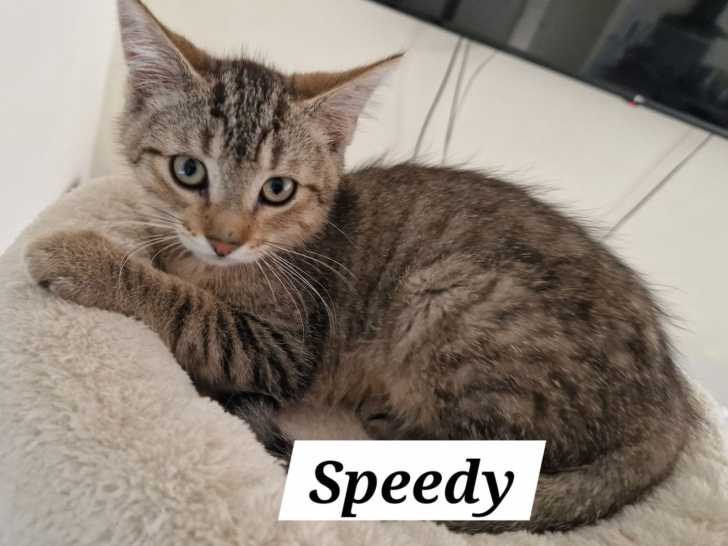 Son nom, c'est Speedy, ce chaton mâle tigré de trois mois que nous vous proposons à l'adoption. Il a besoin d’un foyer patient, sans enfants et qui a déjà un chat.