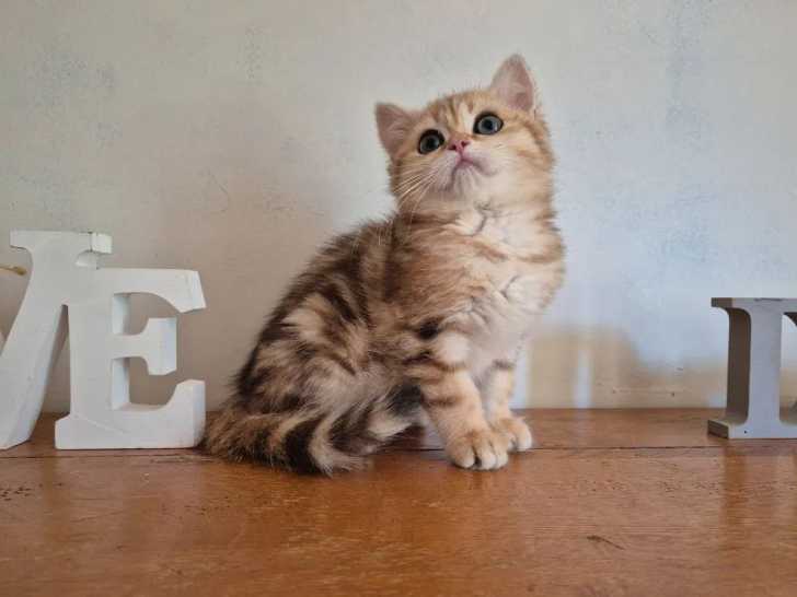 Aliyah, une chatonne British Shorthair est née le 7 mars 2025 dans notre élevage familial de Lozère ; elle possède une robe black golden blotched tabby. Elle montre un tempérament affectueux, joueur et parfaitement sociable.
