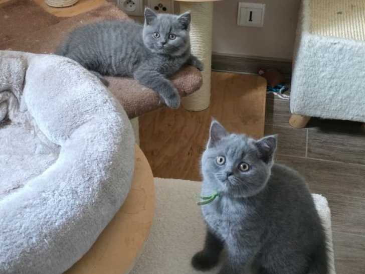 Nous vous proposons d’adopter nos chatons British Shorthair bleus, nés le 08 mars 2025, 3 mâles et 3 femelles disponibles à la vente.