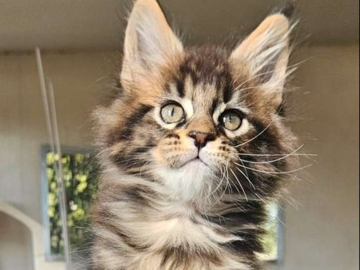 Notre petit mâle est un jeune Maine Coon brown blotched tabby, inscrit dans le Livre Officiel des Origines Félines (LOOF) et issu d’une lignée testée. Il sera principalement un adorable compagnon de famille.
