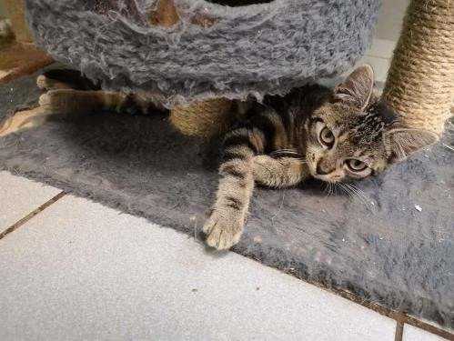 Shany, née le 01 mai 2021 avec une robe brown mackerel tabby, attend patiemment sa nouvelle famille au refuge d’Inzinzac.