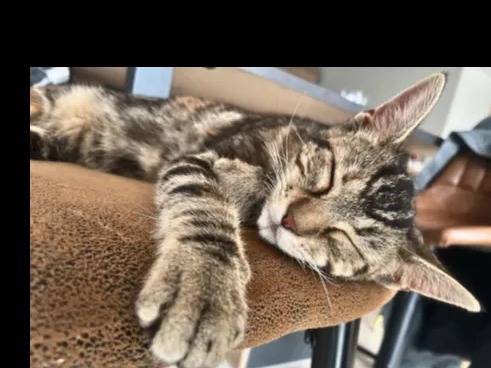 Nous sommes ravis de vous proposer à l'adoption ce chaton femelle au pelage tigré de neuf mois nommé Nia. Celle-ci attend un foyer aimant qui a déjà un chat pour une vie heureuse.