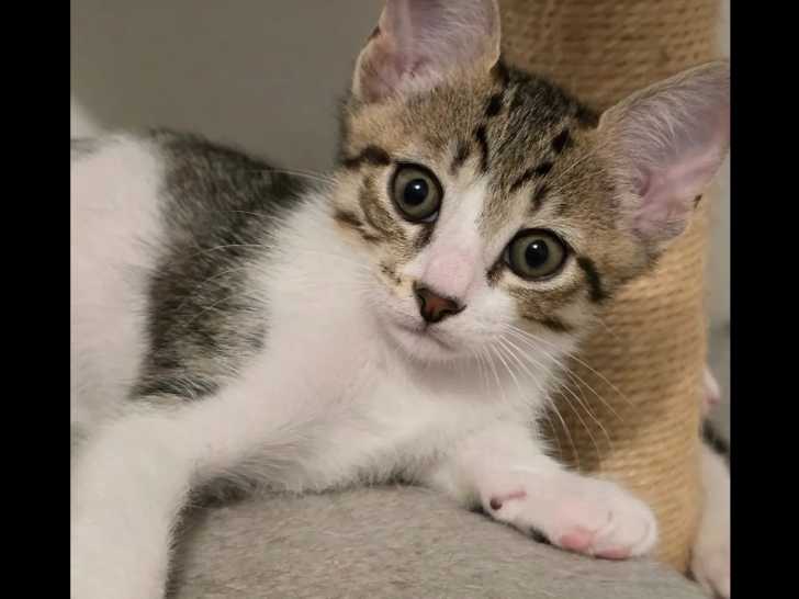 Timéo est un chaton mâle tigré blanc âgé de trois mois que nous avons le plaisir de vous proposer à l'adoption. Il attend une famille qui lui offrira tout l'amour qu'il mérite.
