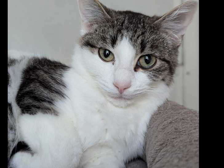 Nous vous proposons à l'adoption Twist, un jeune chat au pelage tigré blanc et âgé de onze mois. Il est à la recherche d'une famille calme et aimante, qui lui offrira une belle vie.