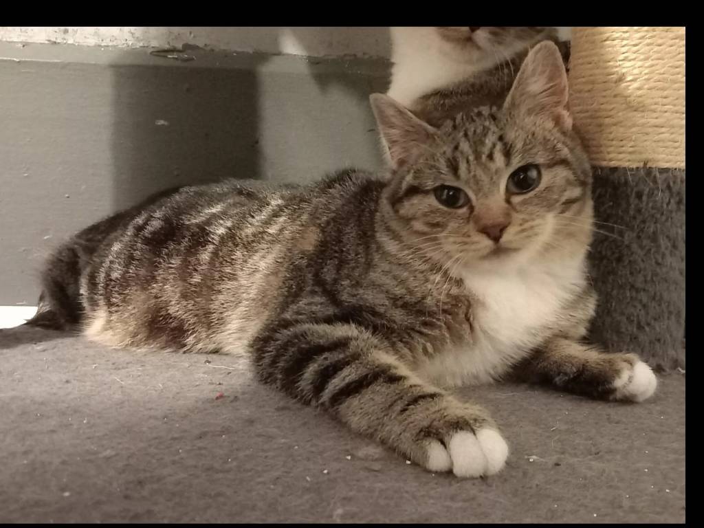 Notre association a le plaisir de vous proposer à l’adoption Amalia, une chatonne de cinq mois au pelage tigré et blanc. Douce et pleine de vie, elle recherche un foyer aimant et confortable pour la vie.