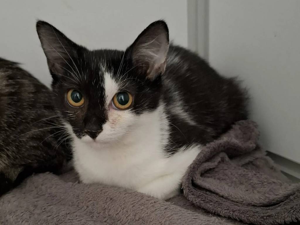 Nous vous proposons à l'adoption ce chaton femelle au pelage noir et blanc de trois mois nommé Astrale. Cette dernière attend un foyer aimant pour la vie.