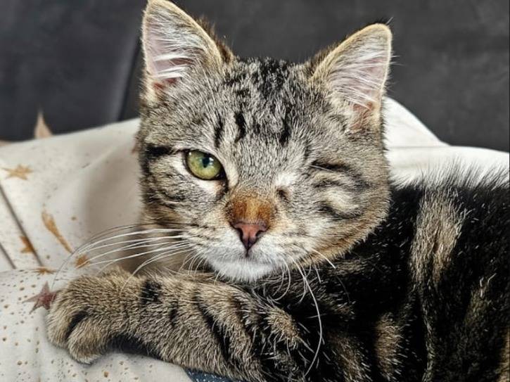 Il a été trouvé errant, tout seul avec un gros coryza qui, malheureusement, a nécessité une énucléation en urgence lors de se prise en charge.