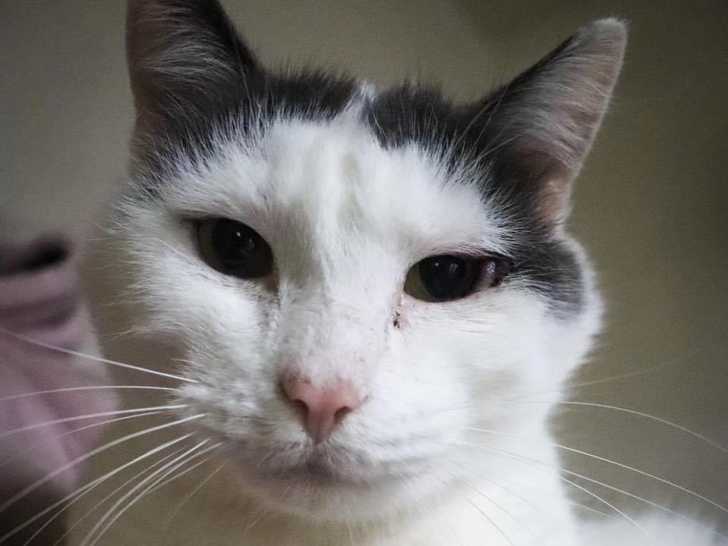 Nous sommes ravis de vous proposer à l'adoption ce chat blanc avec marque noire âgé de huit ans nommé Aldo. Celui-ci ne s'entend pas avec ses congénères et est atteint du virus de l'immunodéficience féline.