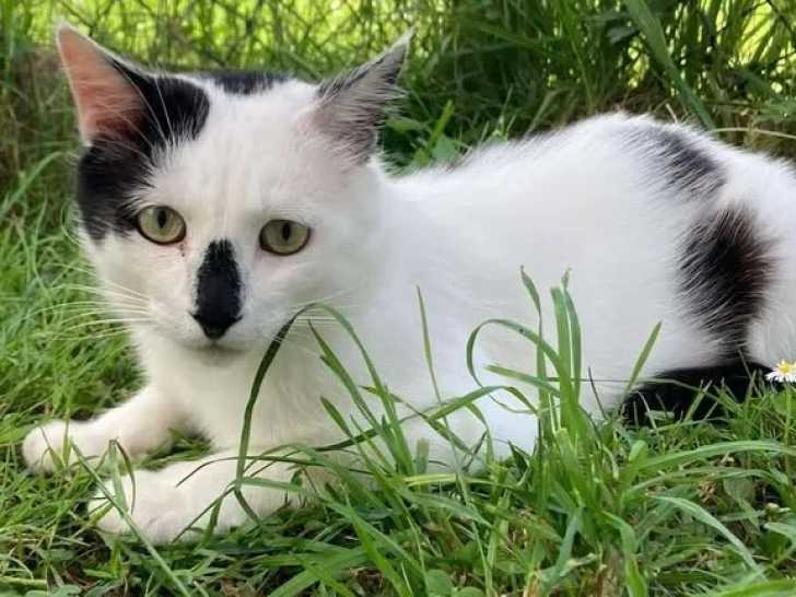 Esmé est son nom, ce chat blanc avec marque noire de cinq ans que nous vous proposons à l'adoption. Il attend un foyer avec un jardin, où il sera le seul animal domestique.