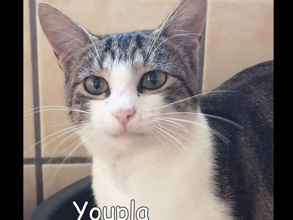 C’est avec plaisir que nous vous proposons à l’adoption Youpla, un chat à la fourrure tigrée blanche d'un an. Il espère trouver un foyer aimant qui saura gagner sa confiance.