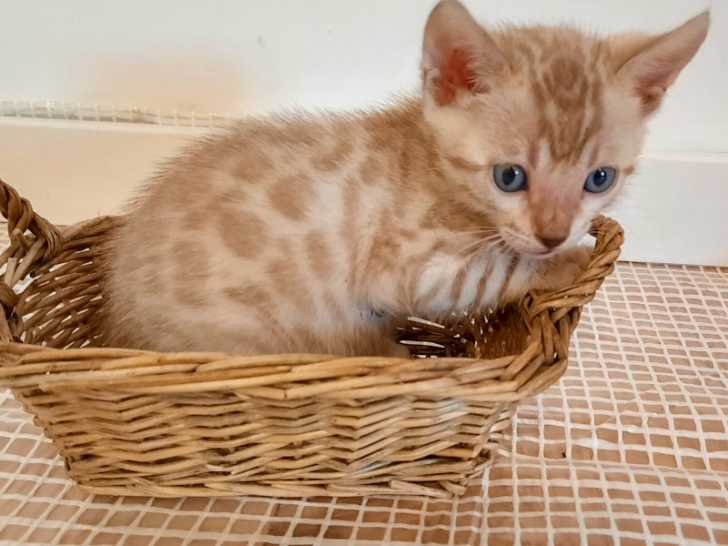 Reste 5 chatons bengal snow à réserver. Nés le 20 août 2020. Ce sont des Bengals LOOF nés du mariage d'Orea (une très jolie petite femelle Bengal seal tabby mink aux yeux verts) et de Nickel Ange (un mâle à l'allure athlétique de panthère des neiges de couleur seal tabby point aux yeux bleus). De beaux pedigrees pour une très jolie lignée.
