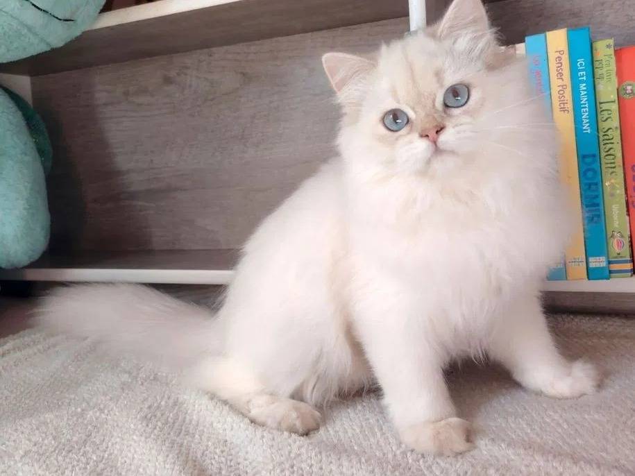 Arwen, un chaton femelle British Longhair née le 27 mars 2025, affiche une robe Silver Chinchilla et de magnifiques yeux bleus. Elle vit avec nous et s’habitue aux enfants, chats et chiens.